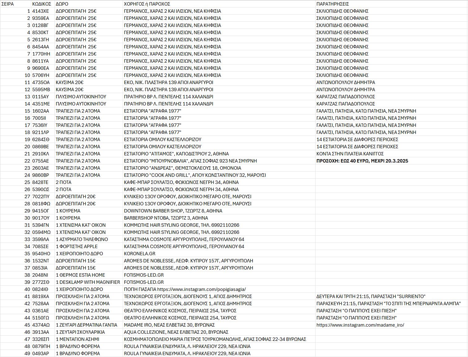 | 11 | ΚΑΥΣΙΜΑ 20€ | ΕΚΟ, ΝΙΚ. ΠΛΑΣΤΗΡΑ 139 ΑΓΙΟΙ ΑΝΑΡΓΥΡΟΙ | ΑΝΤΩΝΟΠΟΥΛΟΥ ΔΗΜΗΤΡΑ | |